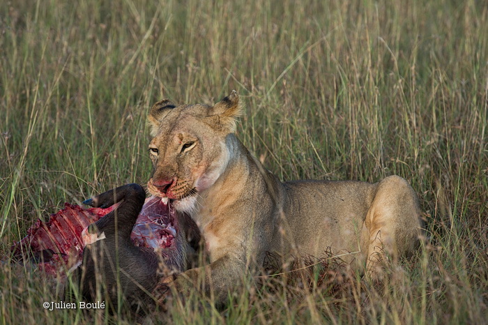/ Parfois le succès est là. Le dernier jour (un de ceux où l’on se demande si on doit faire le safari de plus), nous avons vu 3 lionnes chasser et tuer un phacochère un peu naïf. Voir l’approche dans les herbes hautes et la prise fut captivant mais la mise à mort est un moment difficile à regarder.