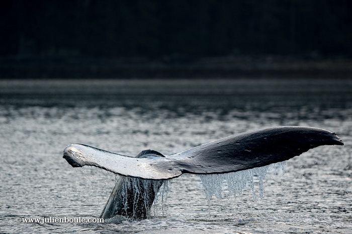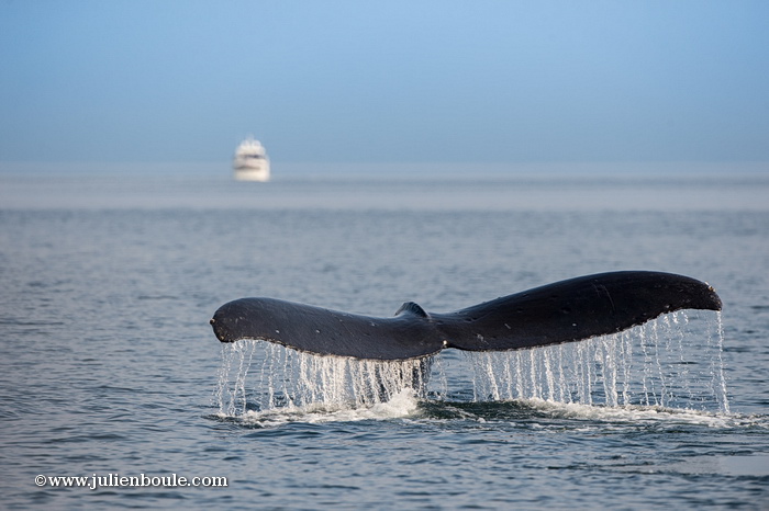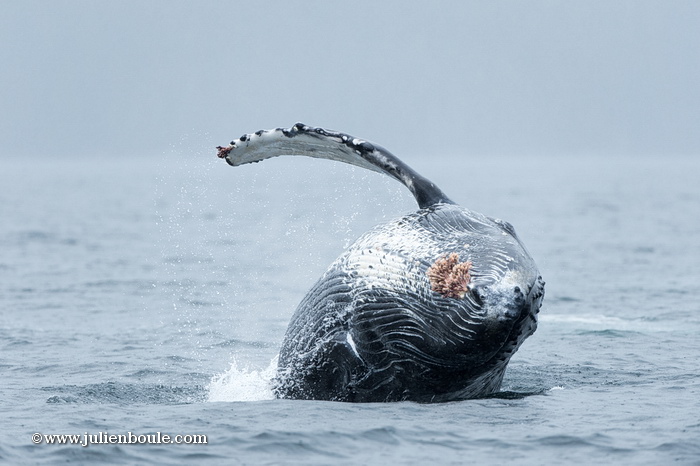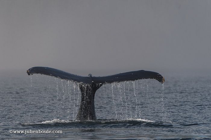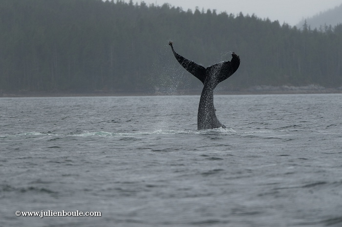 Nous rentrons sur le bateau de Marven sous une pluie battante. Une baleine nous gratifie au passage de quelques coups de caudales assez furieux!