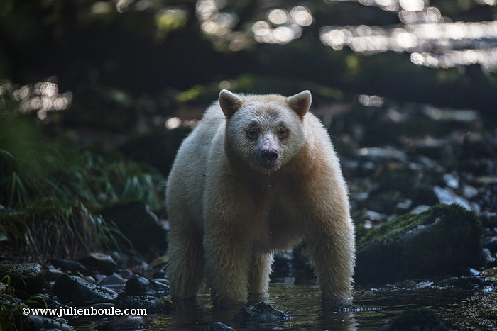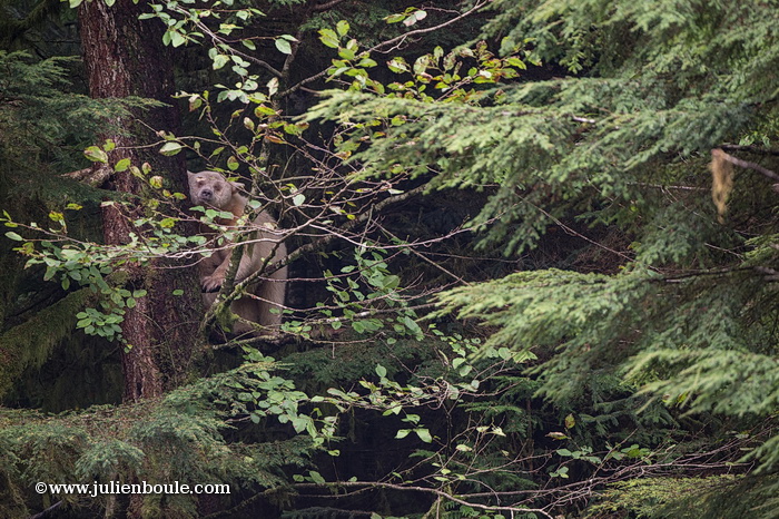 En Septembre 2014, je me suis rendu en Colombie Britannique au Canada dans le cadre d’une croisière organisée par Terres Oubliées. J’ai rencontré à cette occasion des gens extra dont Jean-Marie Séveno. Nous avons du voyager jusqu’à Vancouver puis Prince Rupert et de là, naviguer en voilier jusqu’à l’ile de Gribell. Le but de ce voyage était de rencontrer le « fantôme de la forêt » aussi connu sous le nom d’ »ours esprit ». L’ »ours esprit » n’est pas une espèce à part entière, c’est en fait une sous-espèce de l’ours noir américain dont un ensemble de gènes récessifs ont muté pour lui donner ce pelage blanc crème du plus bel effet. Le nom scientifique de cet ours est l’ours Kermode (ursus americanus Kermodei).