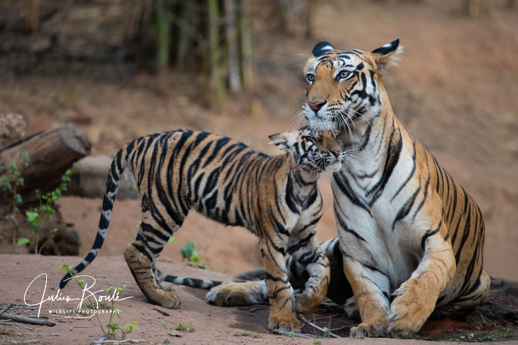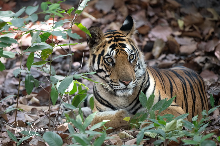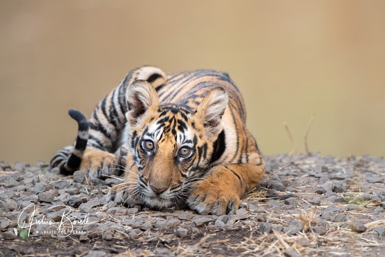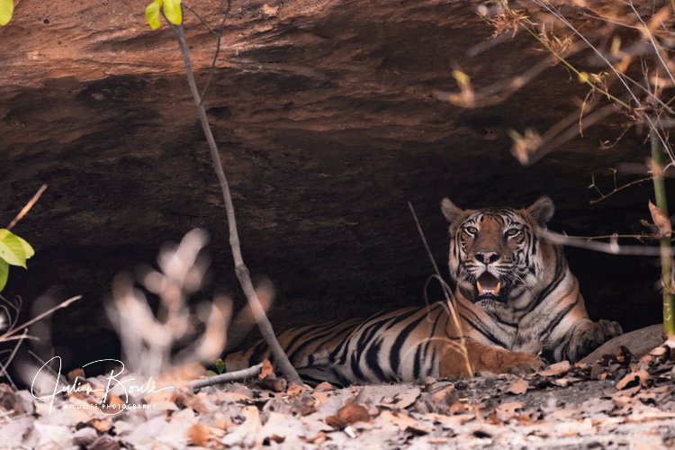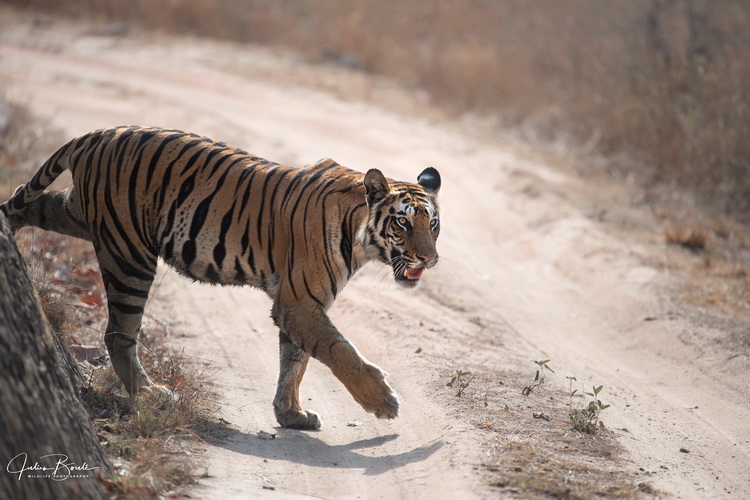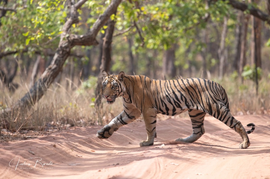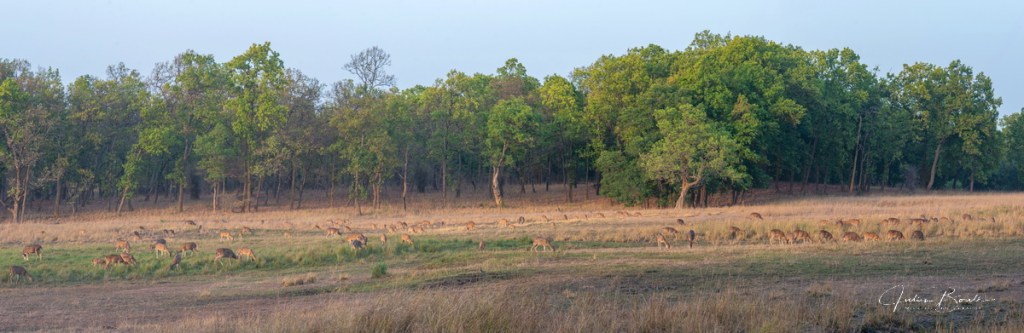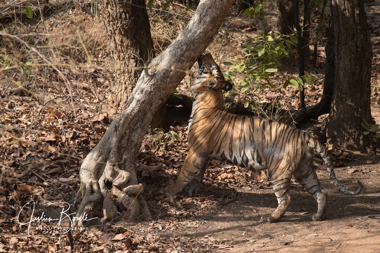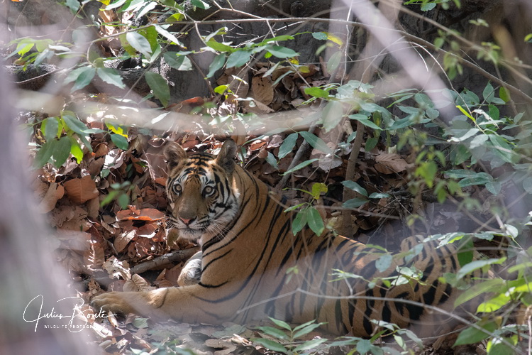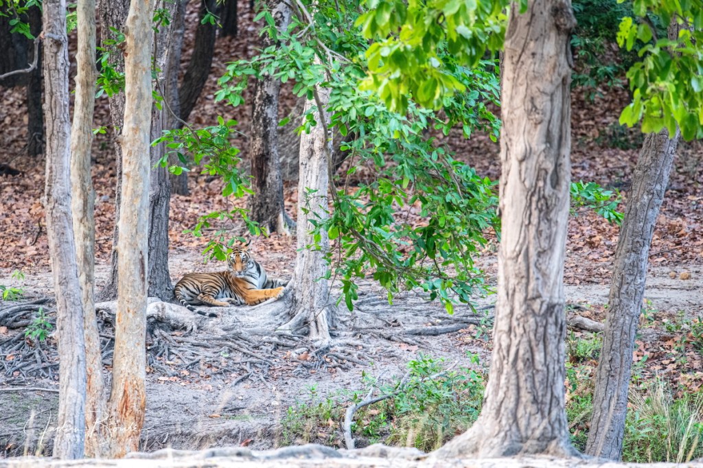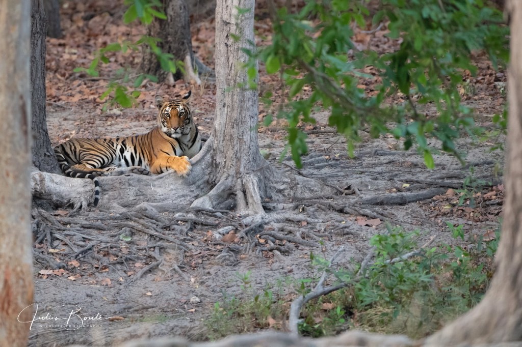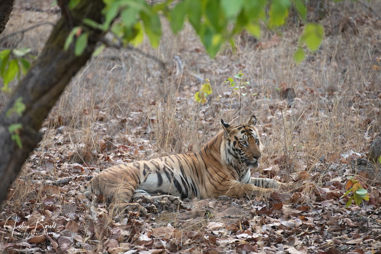 Then, very close to the end of afternoon session, a tigress « Chakradara female » cub appears in a beautiful forested setup. She has a regal attitude and seems to love herself amidst some trees, very nice to watch! That would be our last sighting as the next morning would be empty.