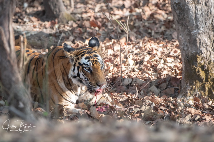 In the afternoon, Cédric is back on his legs and we head to Magdhi zone. Quickly we find the Solo tigress. In the snap of a finger she finds a small deer fawn and kills it. She is with a single cub!