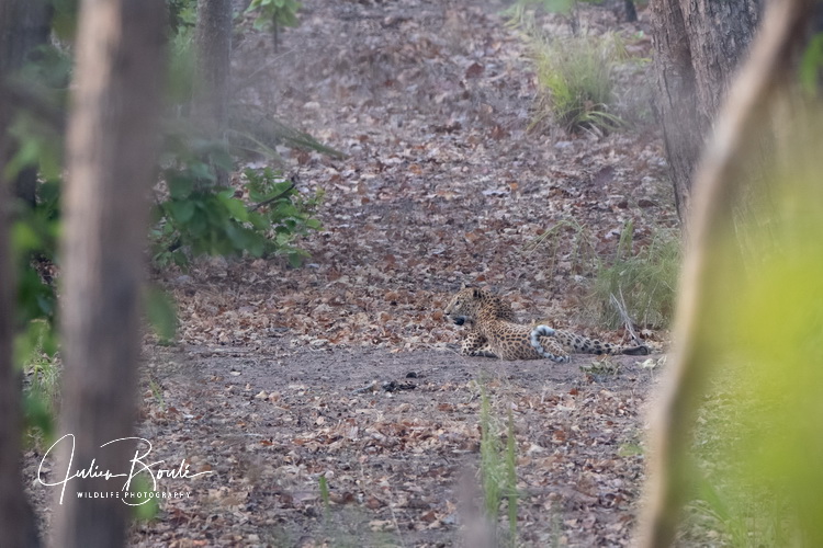 30/05: Have a long search for the occasional big cat in the morning, we end-up hearing chital alarm calls. At some point we hear them from 2 distinct directions. Clearly the sign of a predator out in the open. Cédric has a great catch as he managed to see a leopard lying on the ground and we get a few clicks, great catch man! Then we would also get a sighting of the solo female and bamera’s son!